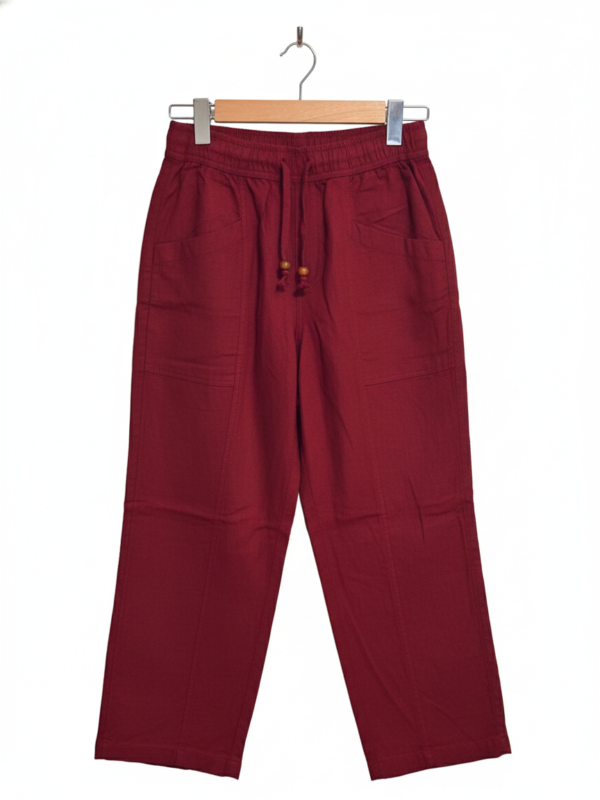 A rich cherry-red pant crafted for comfort and effortless everyday style. Made from a breathable cotton–flax blend, it features a relaxed silhouette with a soft elasticated waist and adjustable drawstring for a comfortable fit. Functional pockets and clean lines make it easy to style for casual outings, travel, or relaxed workdays.